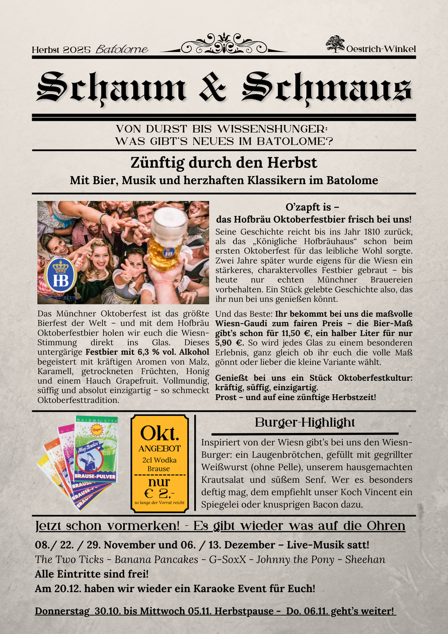 Mit einem sich ständig erweiternden Sortiment verschiedenster Getränke und Speisen hält das Batolome immer wieder eine besondere Überraschung für seine Gäste bereit.